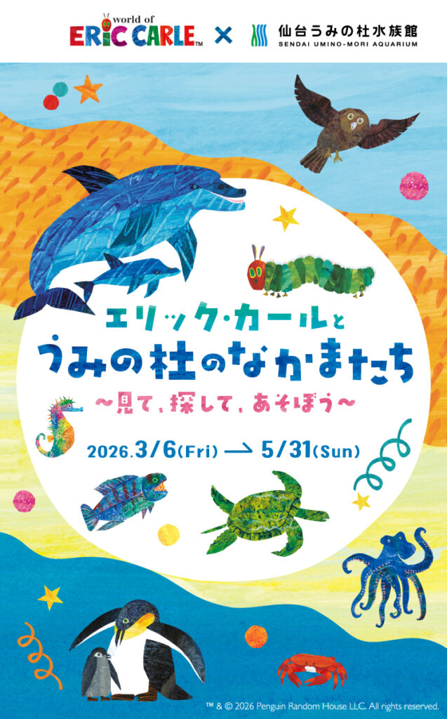 海と人、水と人との、新しい「つながり」をうみだす水族館『仙台うみの杜水族館』では、2026年3月6日(金)から5月31日(日)までの期間、絵本作家エリック・カールの世界観とのコラボレーション企画「エリック・カールとうみの杜のなかまたち~見て、探して、あそぼう~」を開催します。