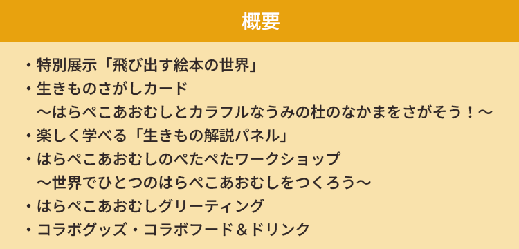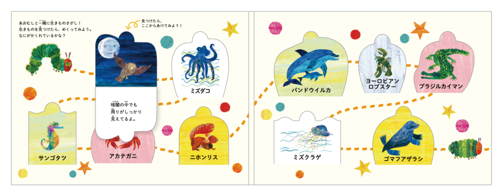まるで絵本の世界から生きものたちが飛び出てきたような特別展示「飛び出す絵本の世界」や、生きものたちの知識を学びながら館内全体を回遊する生きもの探しカード、本イベント限定のグッズやコラボフードなど、エリック・カールの世界観のもとで、リアルな生きものたちについて体感しながら知ることができます。