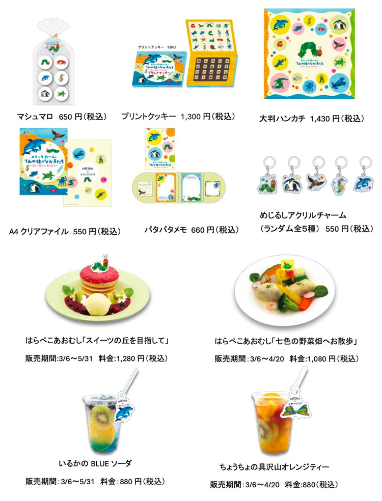 本企画のメインビジュアルを使用したオリジナルコラボグッズを多数販売いたします。また、フードコート「wakuwaku ocean」では、エリック・カール氏の世界観を表現した、ここでしか味わえない見た目もかわいいコラボフードやドリンクを販売いたします。4月21日からは、新たなフード&ドリンクも登場します。お楽しみに!