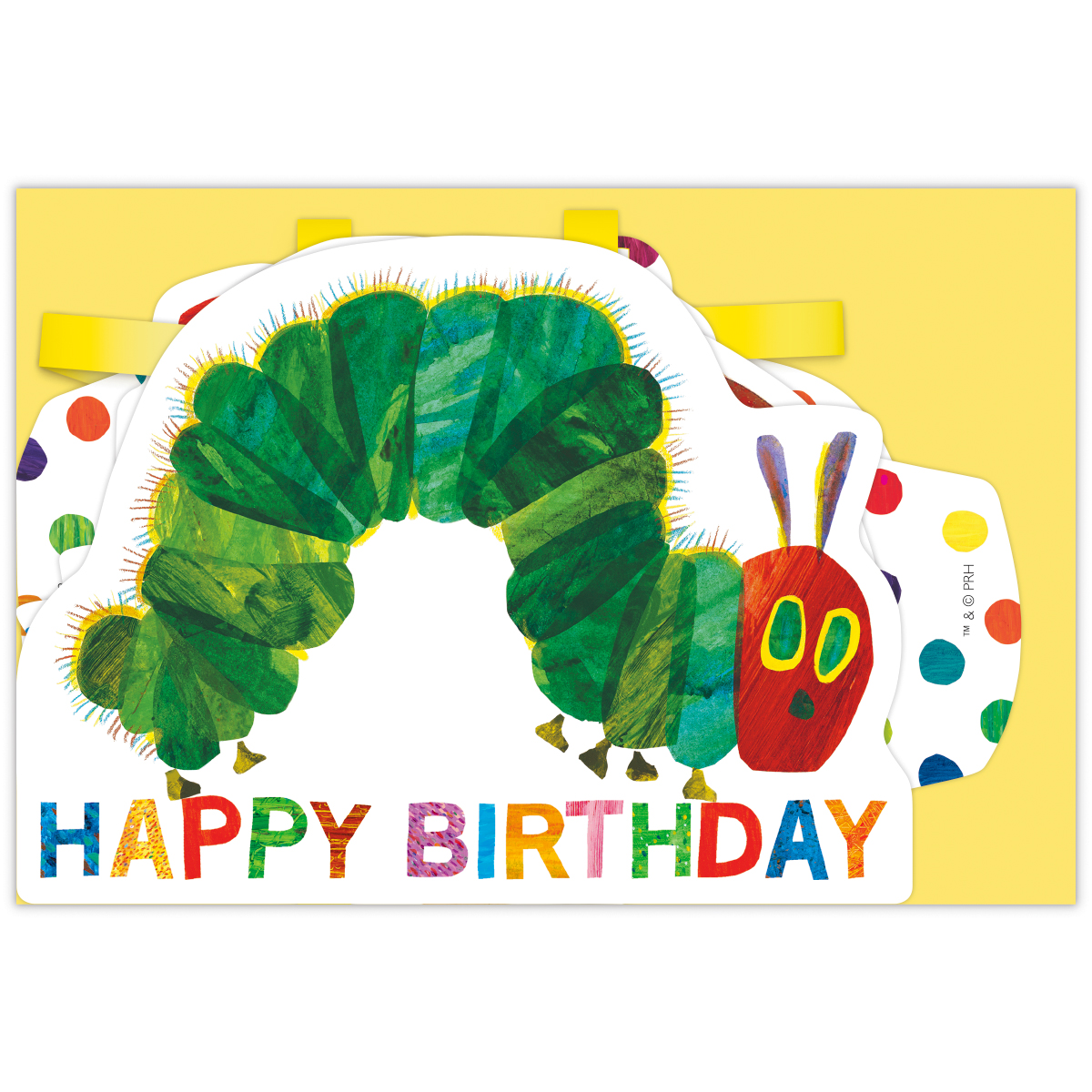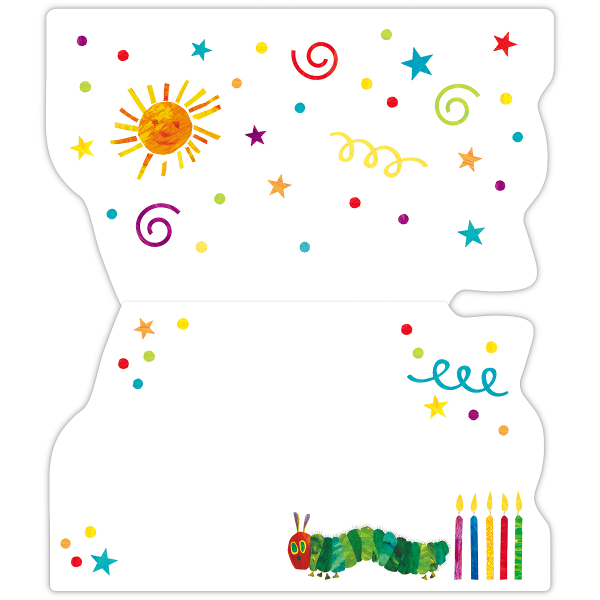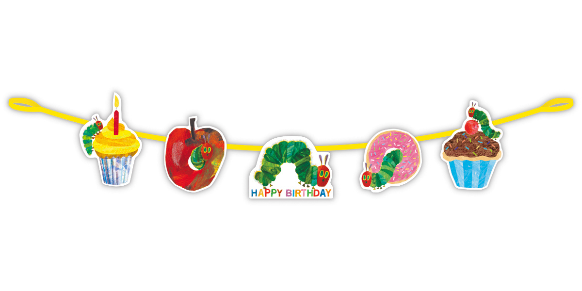 カップケーキやりんご、ドーナツから顔を出す可愛らしいはらぺこあおむしの姿がガーランドタイプのグリーティングカードに! ひも付きでそのまま飾れる仕様なので、お部屋のデコレーションとして楽しめます。記念撮影やパーティーにもぴったりの写真映えするデザインです。
