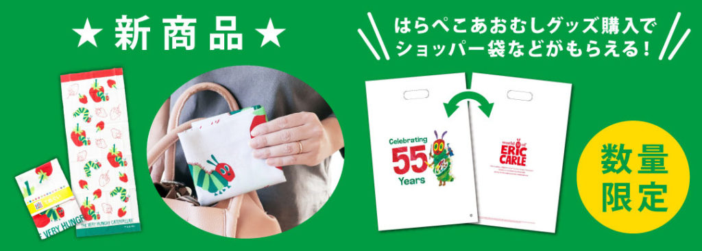 手ぬぐいなどの新商品も発売する他、はらぺこあおむしグッズのご購入で「ショッピングバッグ」や「ポストカード」などの限定ノベルティも!