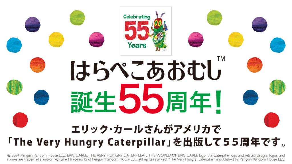エリック・カールさんがアメリカで「The Very Hungry Caterpillar(はらぺこあおむし)」を出版して55周年を記念して、全国の書店内のえほんやさんMOEで「はらぺこあおむしフェア」を開催します。